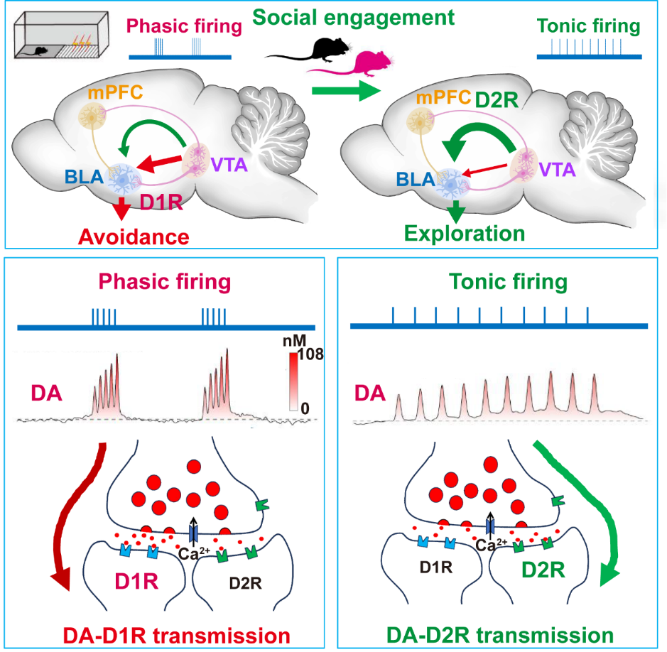 在本研究中发现,中脑腹侧被盖区多巴胺能(VTADA)神经元是编码探索决策的核心枢纽,通过放电模式介导的偏向性突触传递实时编码探索决策:时相型放电(phasic,也称簇状放电)通过介导DA-D1R受体突触传递编码风险警觉,强直型放电(tonic)则通过偏向DA-D2R突触传递编码探索动机。两群VTADA神经元分别通过直接通路和间接通路,共同投射至基底外侧杏仁核(BLA)的同一亚群神经元。其中,以内侧前额叶皮层(mPFC)为中间节点的间接通路(经由D2R受体传递)介导探索行为,并可通过社交互动得到强化;而直接通路(经由D1R受体传递)则介导回避行为,这两条相互竞争的多巴胺共轭通路协同且动态地编码了探索决策的形成。该研究不仅阐明了多巴胺神经元放电模式在探索决策中的核心编码机制,还揭示了探索决策的多巴胺共轭投射环路整合机制,建立了多巴胺偏向性突触传递新理论。